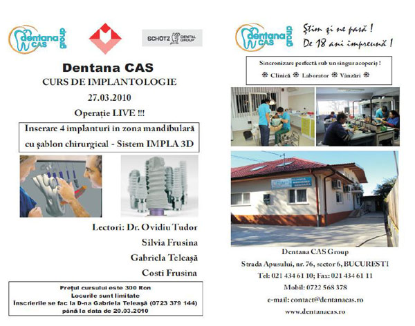 Dentana CAS Group organizeaza in colaborare cu firma Schutz Dental (Germania)organizeaza cursuri de implantologie teoretica si practica utilizand sistemul IMPLA. Acest curs este destinat medicilor dentisti care doresc sa descopere complexitatea si avantajele sistemului IMPLA si cuprinde principiile stiintifice, planificarea tratamentului precum si utilizarea sistemului in restaurarile protetice.