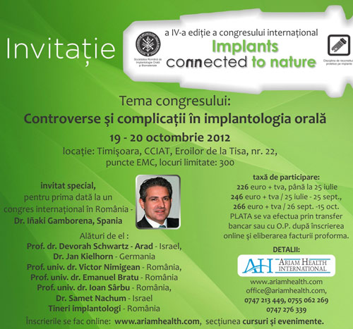 Asa cum v-am obisnuit, ne straduim sa raspundem cerintelor dumneavoastra la capitolul perfectionare in implantologia orala prin abordarea unor teme si probleme de interes maxim si mai ales prin invitarea unor lectori cu recunoastere internationala!